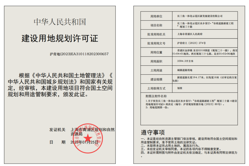 2.地表部分采用划拨方式:鉴于规划三十路是服务于社会公众的市政基础设施,具有明显的公共属性,其地表部分的建设用地使用权严格按程序以划拨方式供给项目单位——长三角一体化示范区新发展建设有限公司。此举保障了公益项目的顺利实施,降低了项目建设成本。该部分手续于2023年7月高效完成。